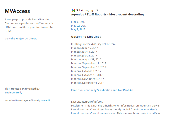 MV Access was created to provide broader access to the agendas and staff reports for the newly created Rental Housing Committee. It is imperiative that the committee runs transparently and all the stakeholders are able to easily get information about the implementation of the Community Stabilization and Fair Rent Act (CSFRA). However, since staff time and resources are limited, I created a website where the public can read the agendas easily on thier phone and in a number of different languages. View project.